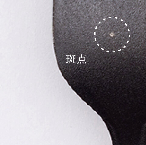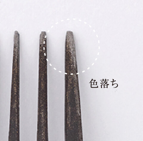 - 硬い物や鋭利な物でこすると黒染めが薄くなる原因となります。また、 長期の使用により、黒染めが薄くなることがあります。