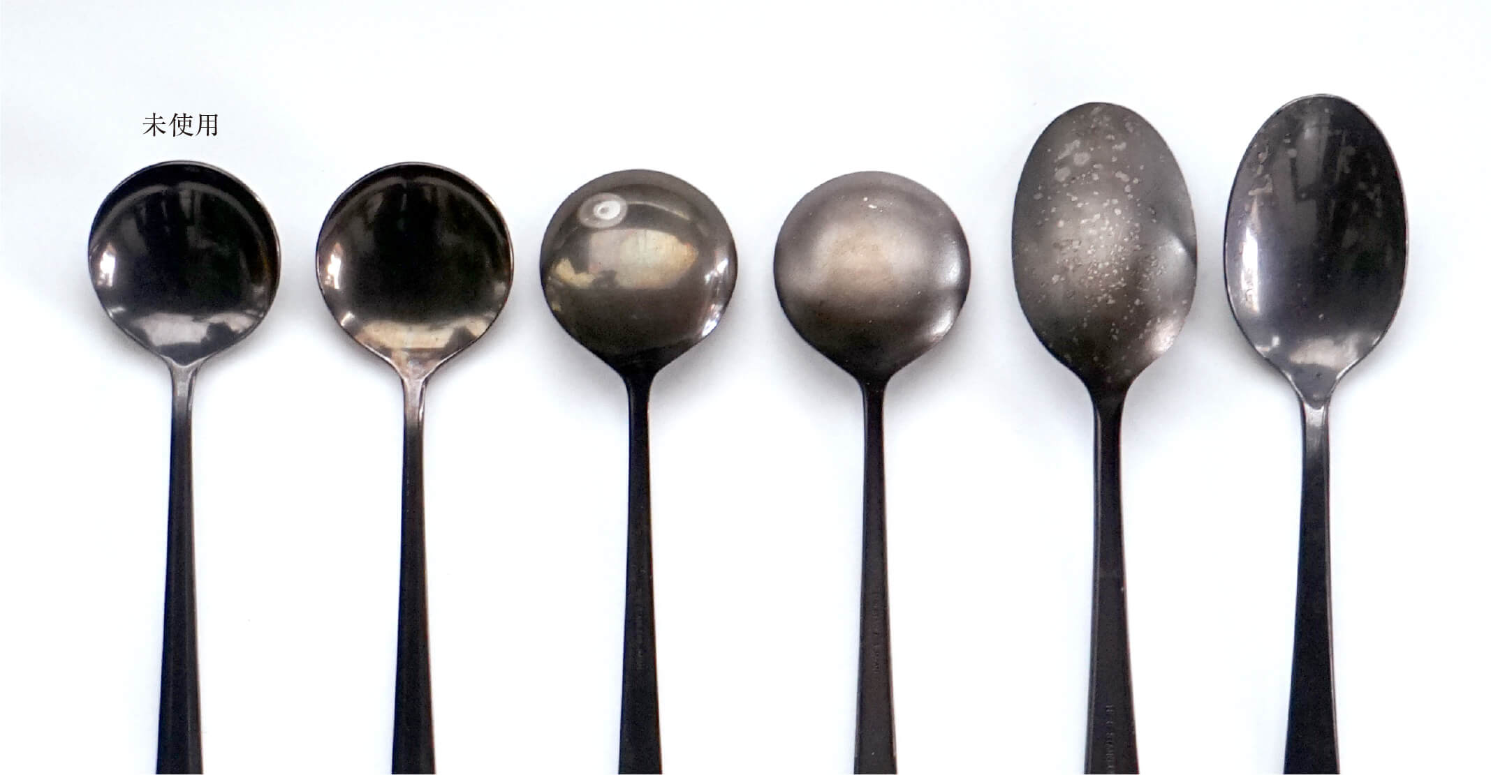 金属の黒染めは塗装ではないため、使い続けることによって変化が生まれます。変色があったり、孔食と呼ばれる白い斑点が出現したり、黒色が擦れて薄くなっていくことがあります。使う人や使う環境によって変化も異なり、それぞれの個性で育っていきます。 履き込まれたデニムや使い込まれたレザーのように、変化していく様子もお楽しいただけます。
