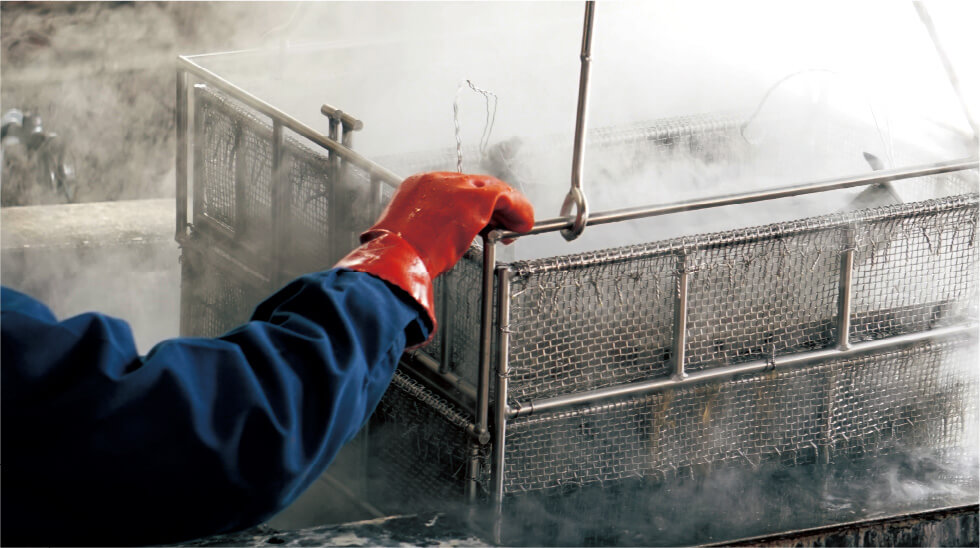 金属を黒染め液といわれるアルカリ性の液に漬け込みます。全体に液が触れるように治具を使用したり、
